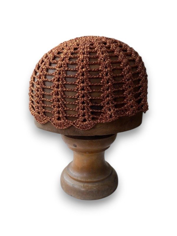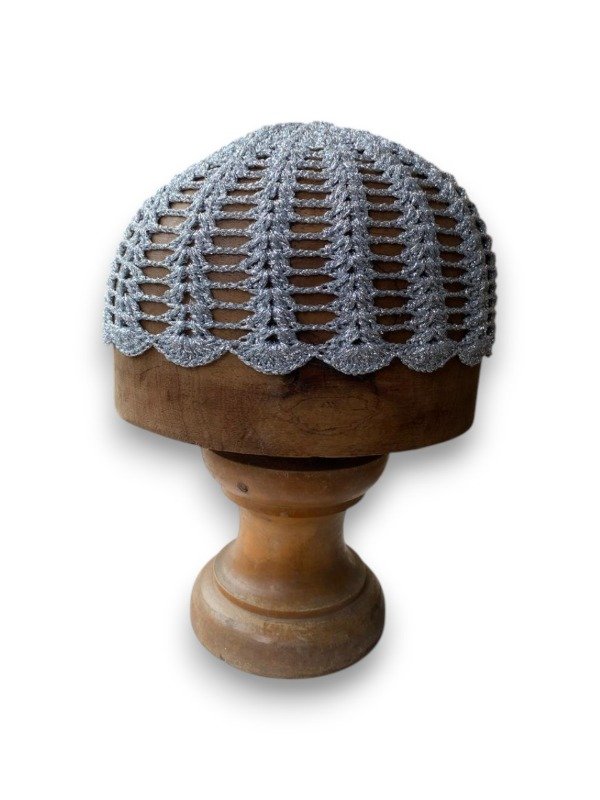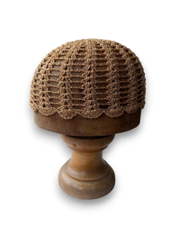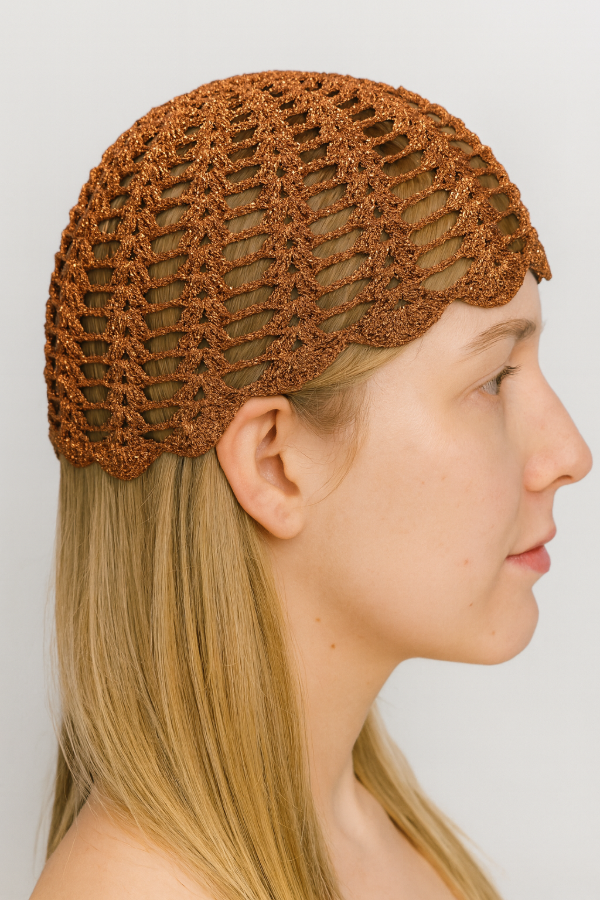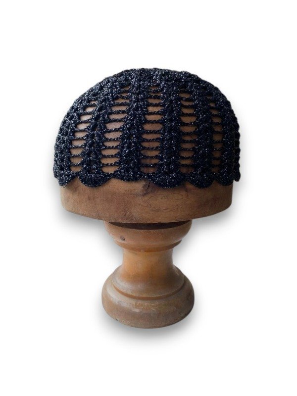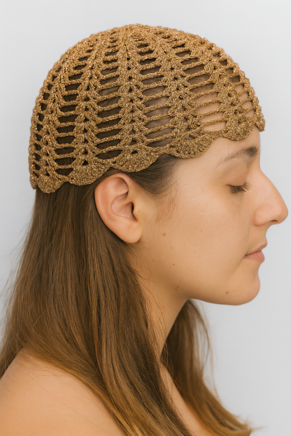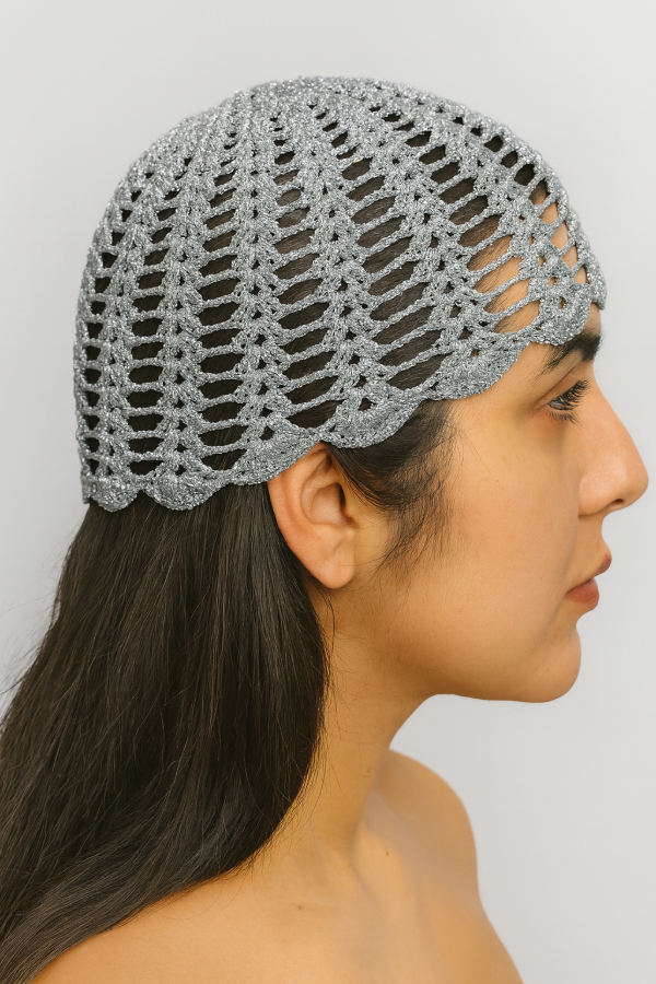 Casquete tejido completamente a crochet, elaborado a mano con precisión para lograr un diseño calado que resalta la textura y el brillo del material. Su composición es 100% Luxury Lurex, un hilo de alta calidad que aporta un acabado metálico sofisticado, liviano y resistente. El resultado es una pieza única, flexible y cómoda, ideal para complementar looks elegantes, escénicos o festivos con un toque artesanal y distinguido.